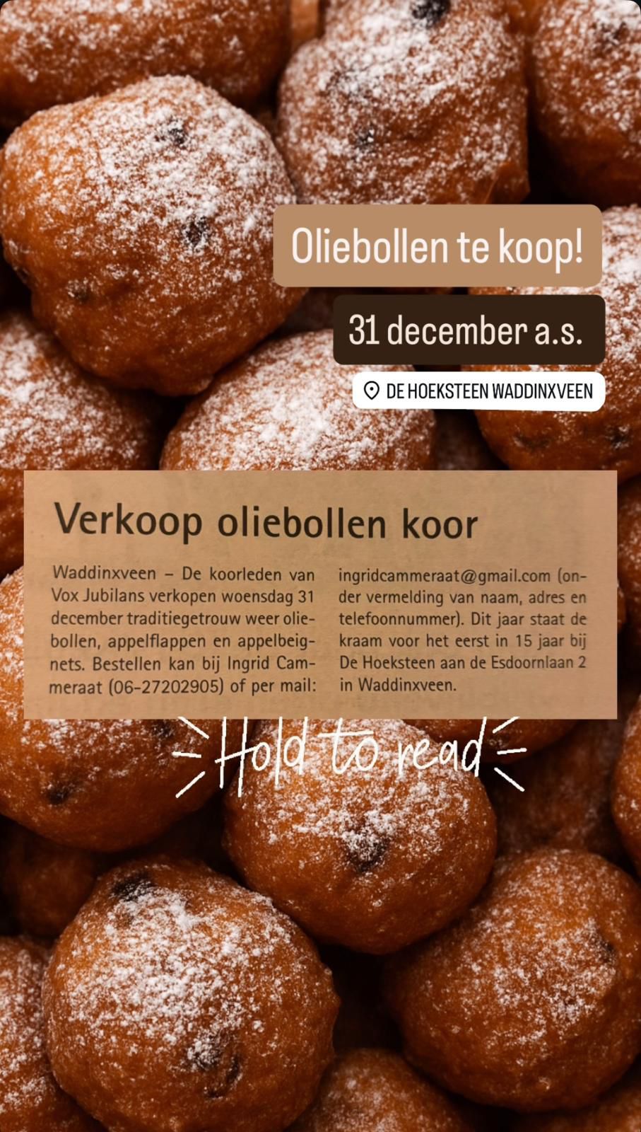 De koorleden van Vox Jubilans verkopen D.V. woensdag 31 december traditiegetrouw weer oliebollen, appelflappen en appelbeignets.